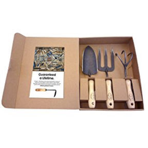 The Dewit garden tool gift set contains three hand forged Swedish Boron steel garden tools displayed in a cardboard box.