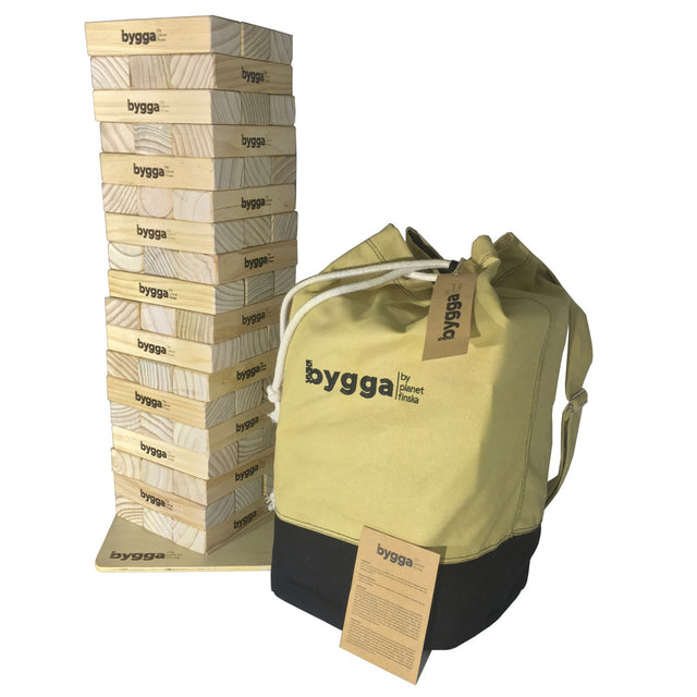 Bygga is the Swedish word for 'build'. This jenga-style game involves building a tower and taking turns to add pieces. The tower starts at 70cm and can extend to 2m in height as the game progresses. The whole kit comes in a canvas duffle bag with a stabilising base board.
